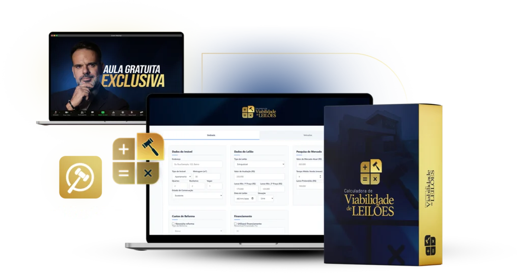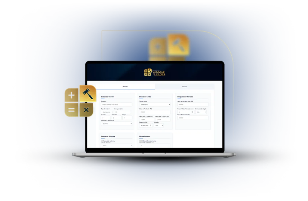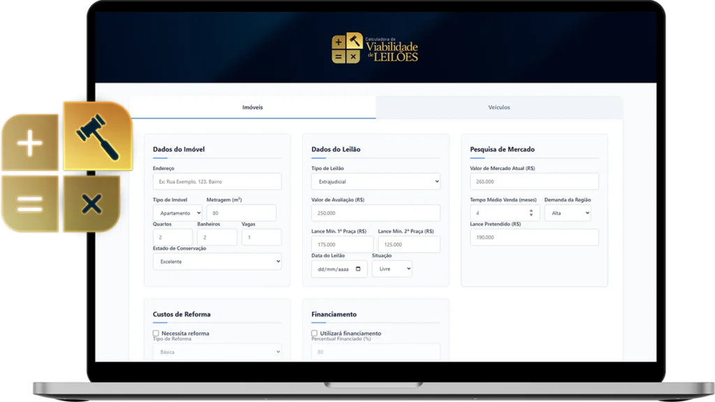 Em minutos, a Calculadora de Viabilidade de Leilões calcula ROI, lucro líquido e prazo de retorno para imóveis e veículos — decida com clareza e só entre quando compensa.